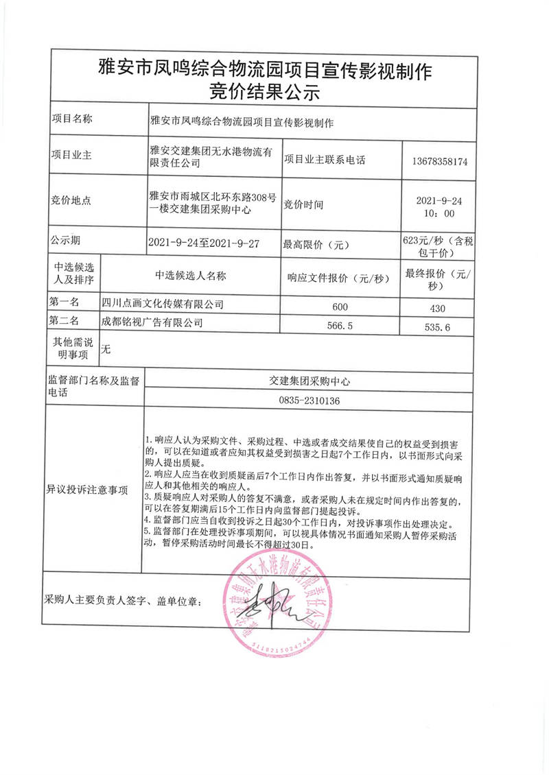 雅安交建集團(tuán)無水港物流有限責(zé)任公司雅安市鳳鳴綜合物流園項目宣傳影視制作競價結(jié)果公示
