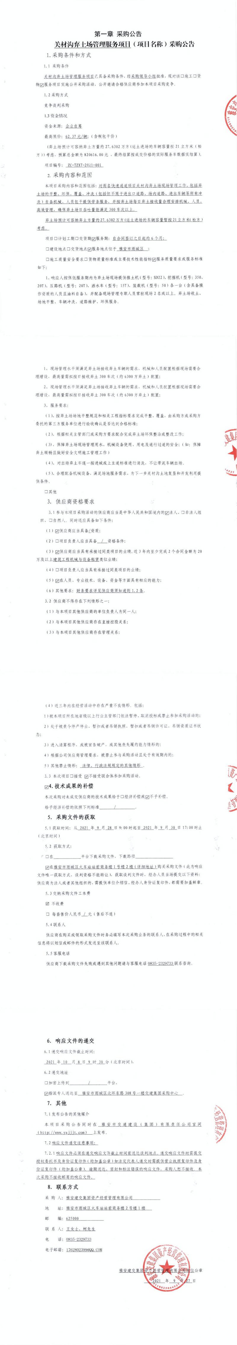 雅安交建集團(tuán)資產(chǎn)經(jīng)營管理有限公司關(guān)材溝棄土場管理服務(wù)項(xiàng)目采購公告