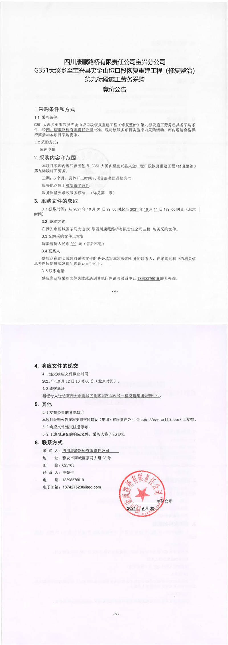 四川康藏路橋有限責(zé)任公司寶興分公司G351大溪鄉(xiāng)至寶興縣夾金山埡口段恢復(fù)重建工程(修復(fù)整治)第九標(biāo)段施工勞務(wù)采購競價(jià)公告