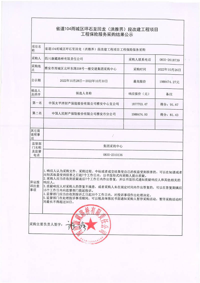 四川康藏路橋有限責任公司省道104雨城區(qū)坪石至回龍(洪雅界)段改建工程項目工程保險服務(wù)采購結(jié)果公示