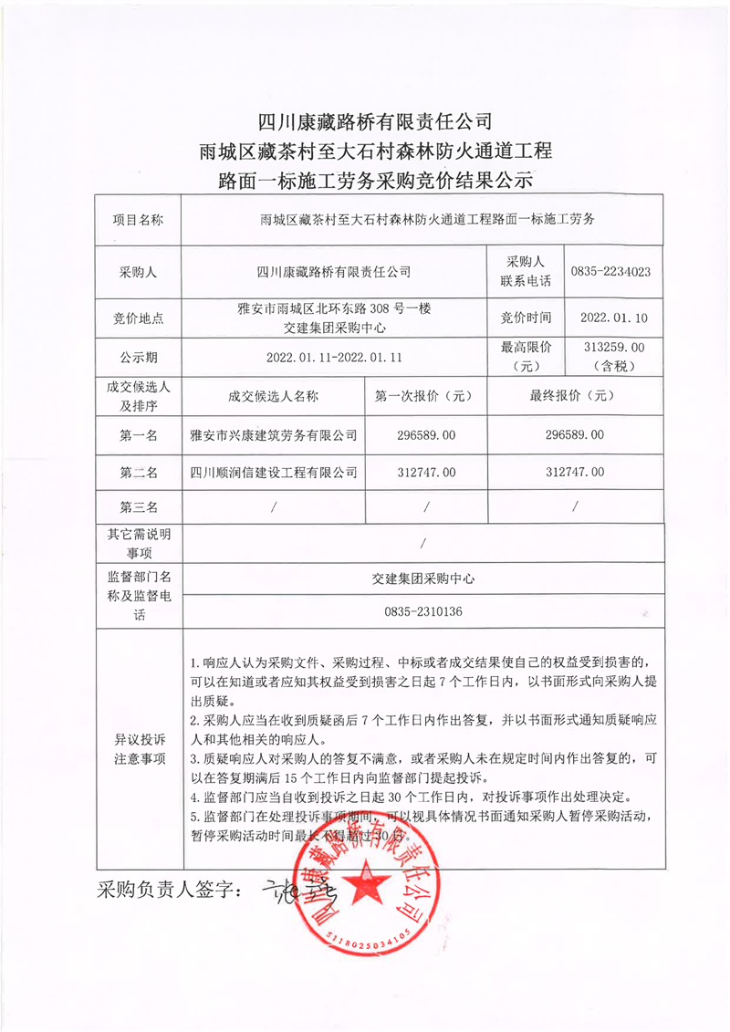 四川康藏路橋有限責任公司雨城區(qū)藏茶村至大石村森林防火通道工程路面一標施工勞務采購競價結果公示