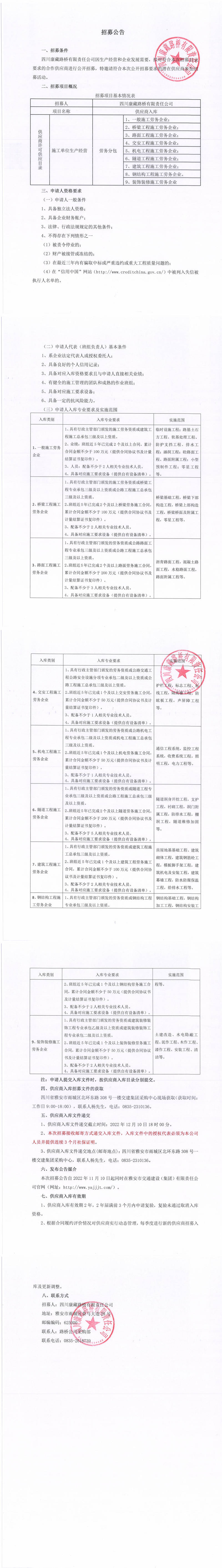 四川康藏路橋有限責(zé)任公司2022年第四季度供應(yīng)商入庫招募公告