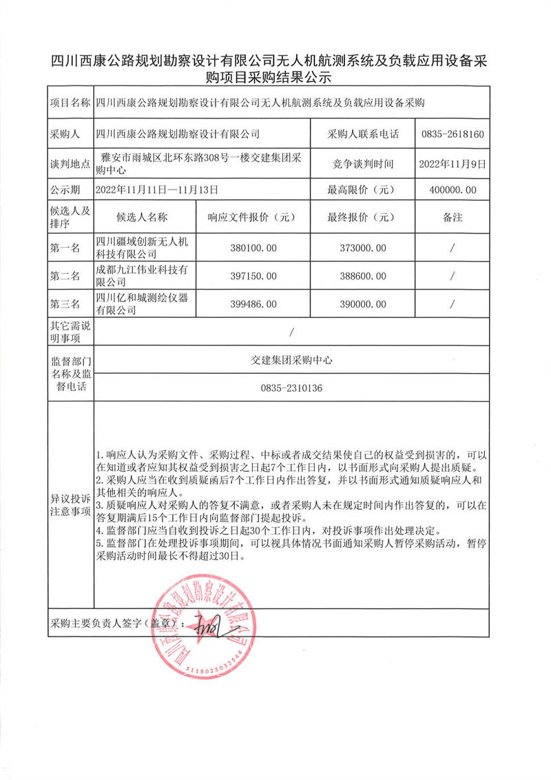 四川西康公路規(guī)劃勘察設(shè)計(jì)有限公司無(wú)人機(jī)航測(cè)系統(tǒng)及負(fù)載應(yīng)用設(shè)備采購(gòu)項(xiàng)目采購(gòu)結(jié)果公示