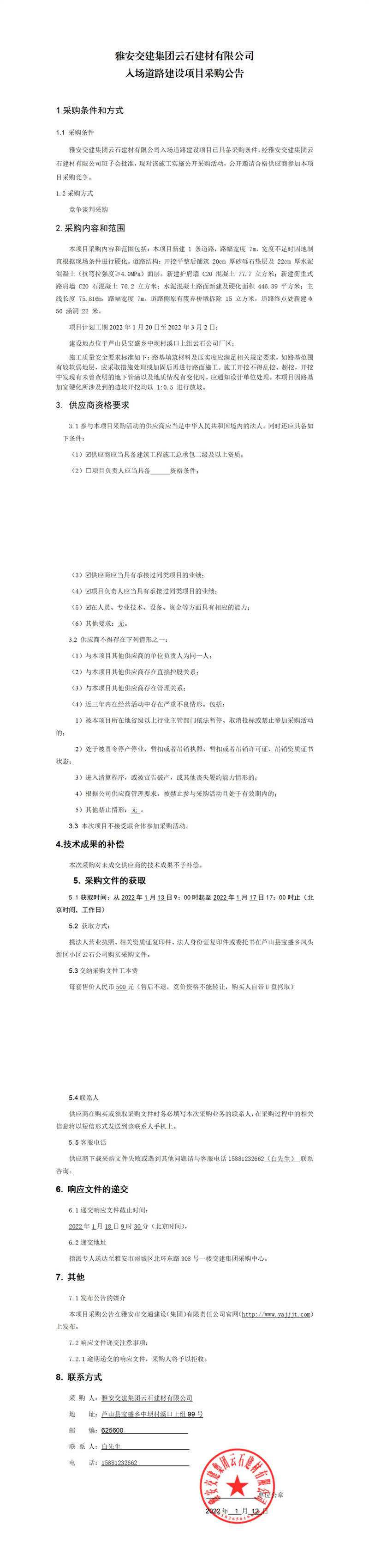 雅安交建集團(tuán)云石建材有限公司入場(chǎng)道路建設(shè)項(xiàng)目采購公告