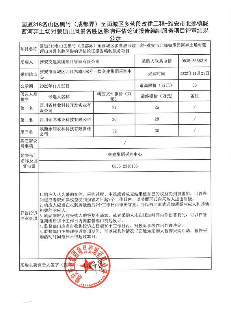 雅安交建集團(tuán)項(xiàng)目管理有限公司國道318名山區(qū)黑竹(成都界)至雨城區(qū)多營段改建工程-雅安市北郊鎮(zhèn)隴西河棄土場對(duì)蒙頂山風(fēng)景名勝區(qū)影響評(píng)估論證報(bào)告編制服務(wù)評(píng)審結(jié)果公示