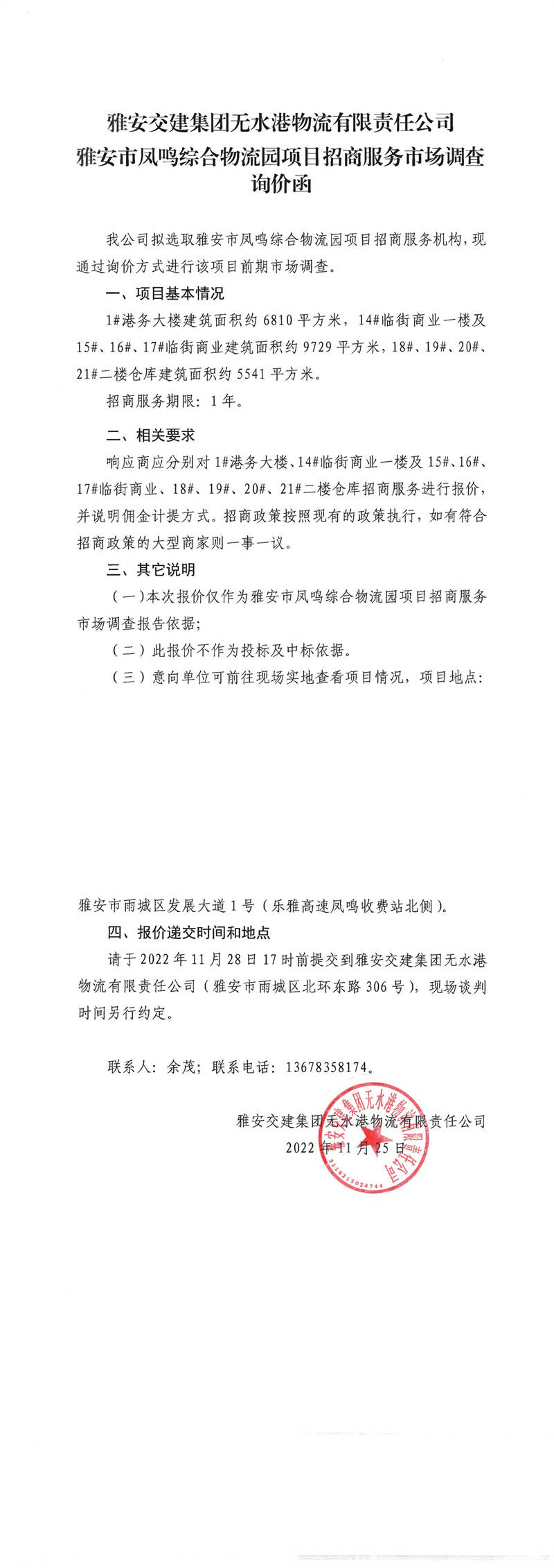 雅安交建集團(tuán)無水港物流有限責(zé)任公司雅安市鳳鳴綜合物流園項(xiàng)目招商服務(wù)市場調(diào)查詢價函