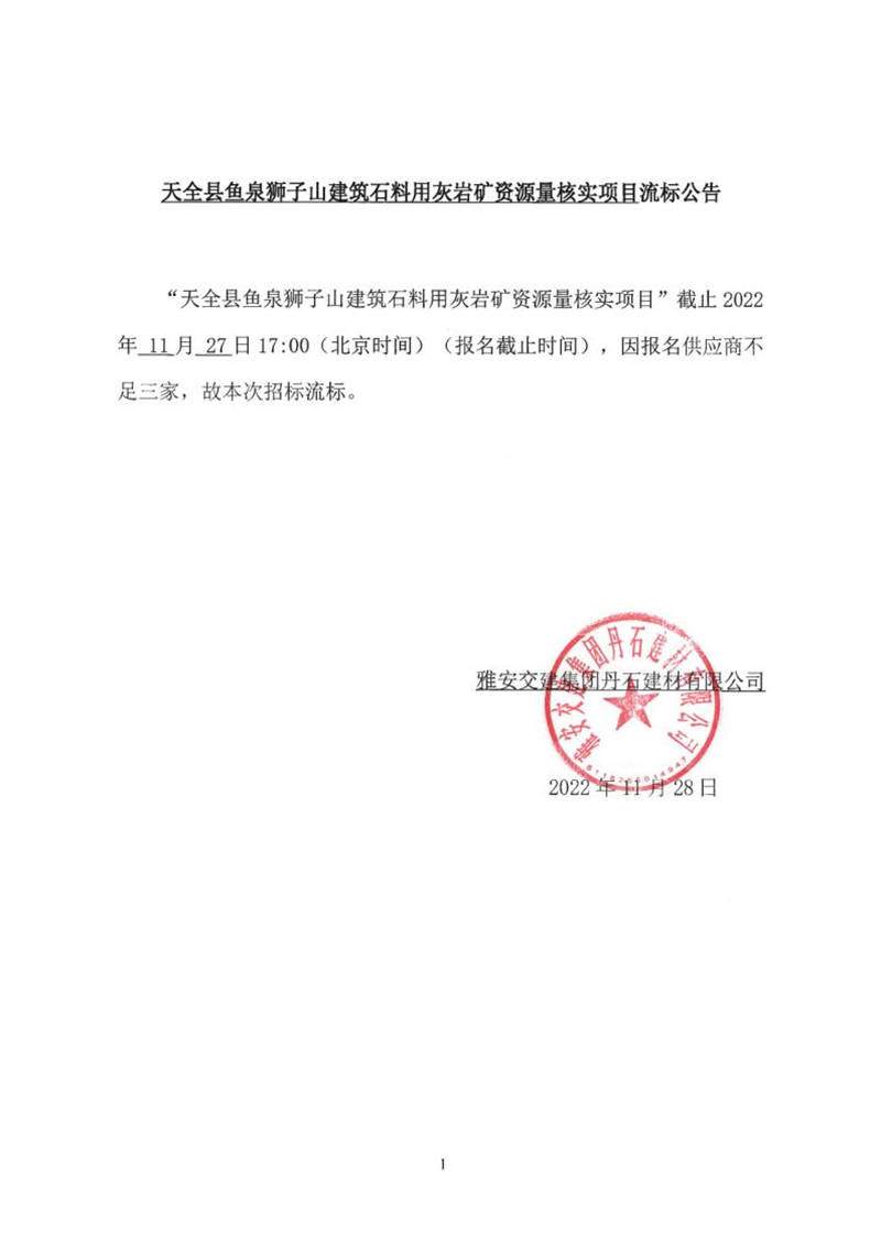 雅安交建集團丹石建材有限公司天全縣魚泉獅子山建筑石料用灰?guī)r礦資源量核實項目流標(biāo)公告