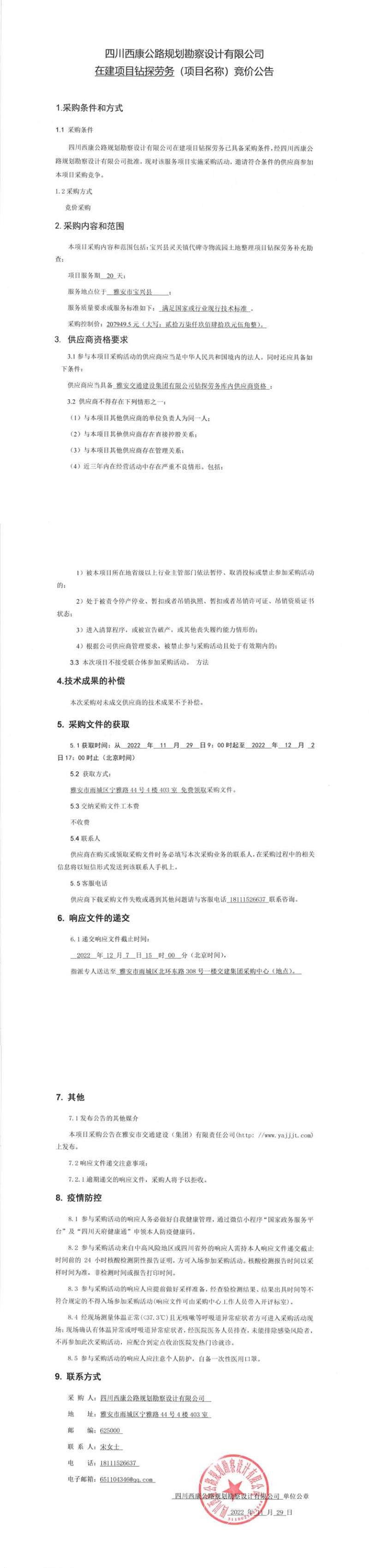 四川西康公路規(guī)劃勘察設(shè)計(jì)有限公司在建項(xiàng)目鉆探勞務(wù)競價公告
