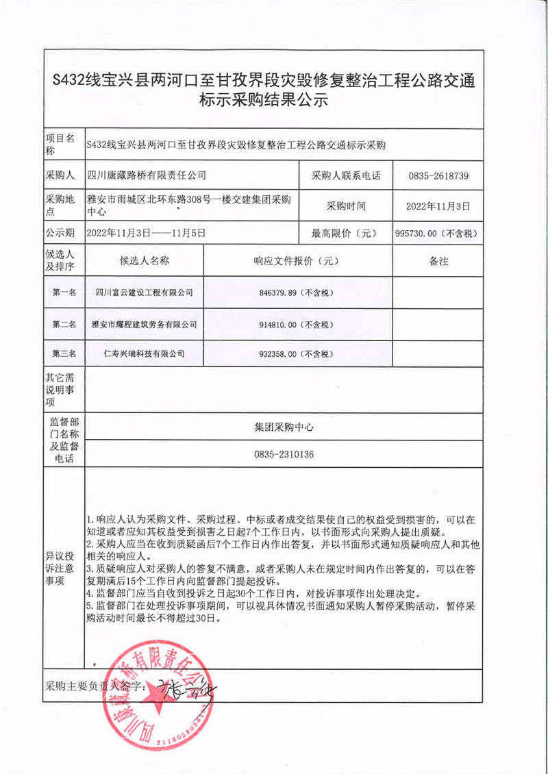 四川康藏路橋有限責(zé)任公司S432線寶興縣兩河口至甘孜界段災(zāi)毀修復(fù)整治工程公路交通標示采購結(jié)果公示