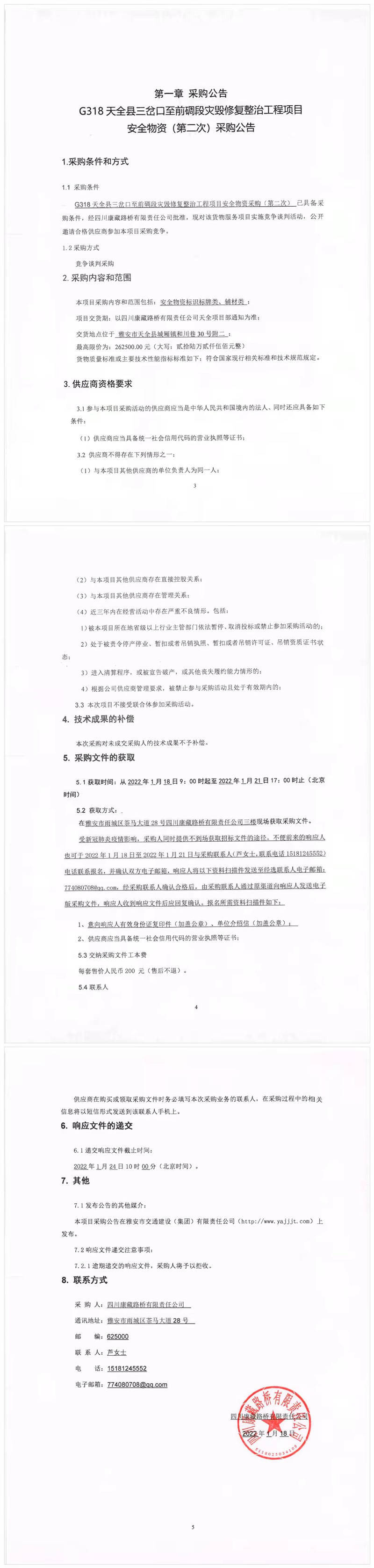 四川康藏路橋有限責(zé)任公司G318天全縣三岔口至前碉段災(zāi)毀修復(fù)整治工程項目安全物資(第二次)采購公告