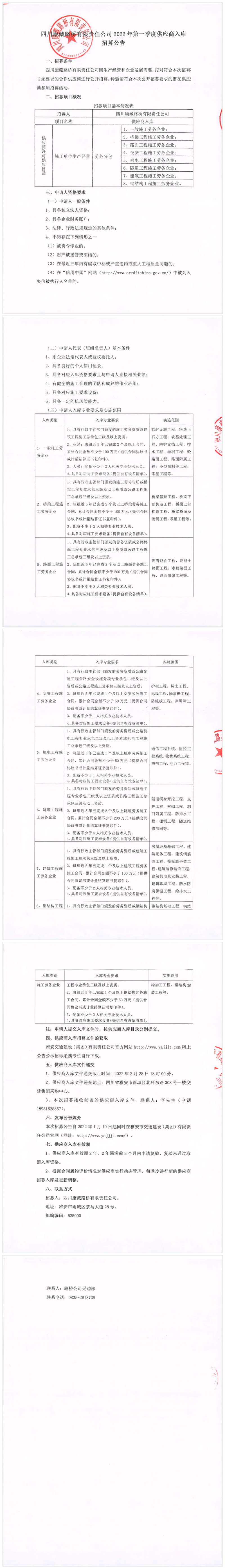 四川康藏路橋有限責任公司2022年第一季度供應(yīng)商入庫招募公告