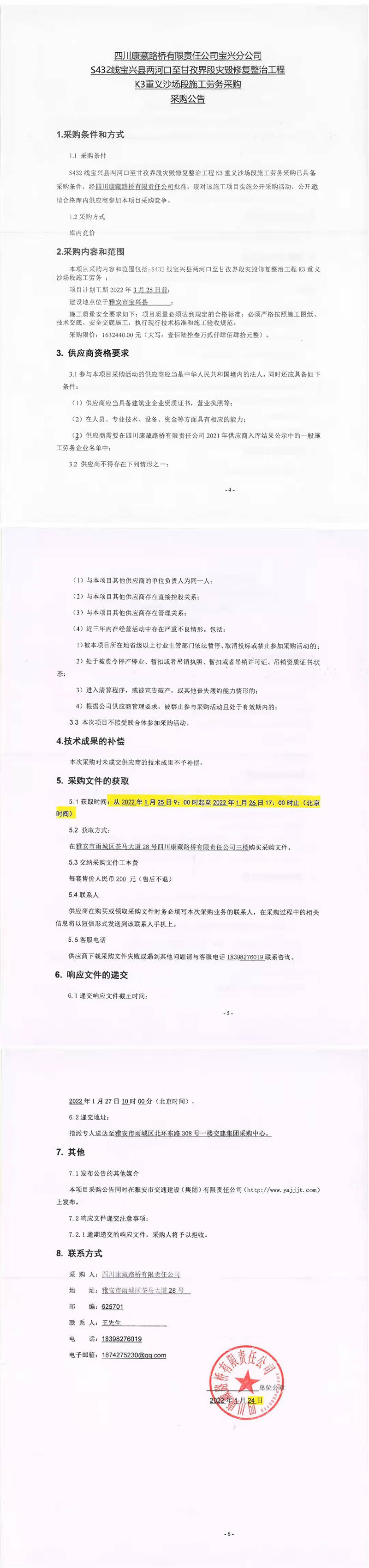 四川康藏路橋有限責任公司寶興分公司S432線寶興縣兩河口至甘孜界段災毀修復整治工程K3重義沙場段施工勞務采購采購公告