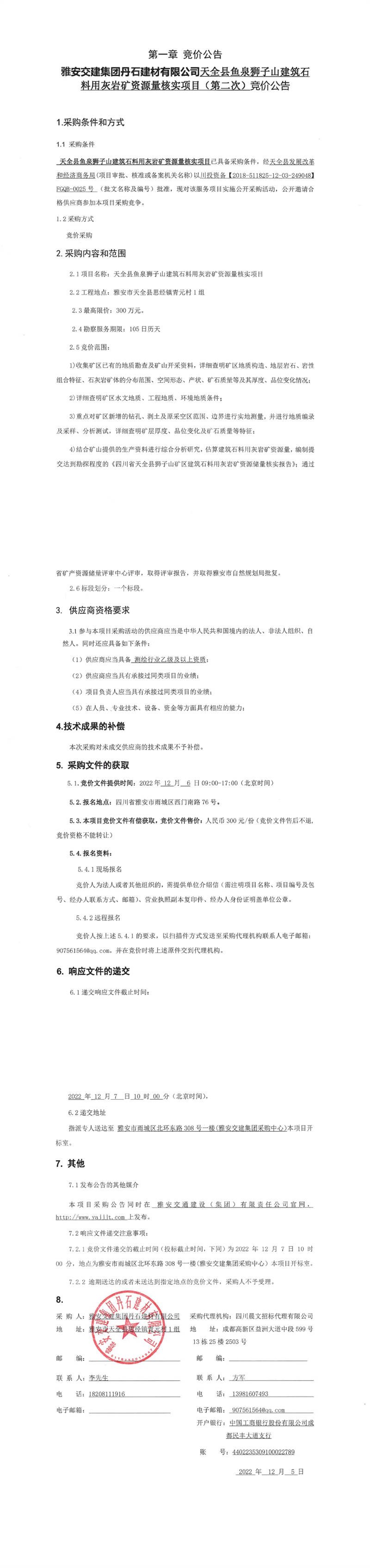 雅安交建集團(tuán)丹石建材有限公司天全縣魚泉獅子山建筑石料用灰?guī)r礦資源量核實(shí)項(xiàng)目(第二次)競價(jià)公告