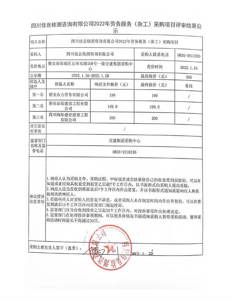 四川佳岳檢測(cè)咨詢有限公司2022年勞務(wù)服務(wù)(雜工)采購(gòu)項(xiàng)目評(píng)審結(jié)果公示