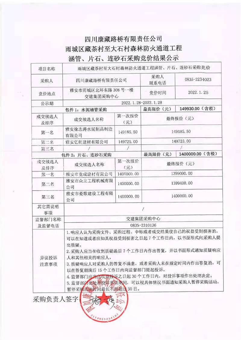 四川康藏路橋有限責(zé)任公司雨城區(qū)藏茶村至大石村森林防火通道工程涵管、片石、連砂石采購競價(jià)結(jié)果公示