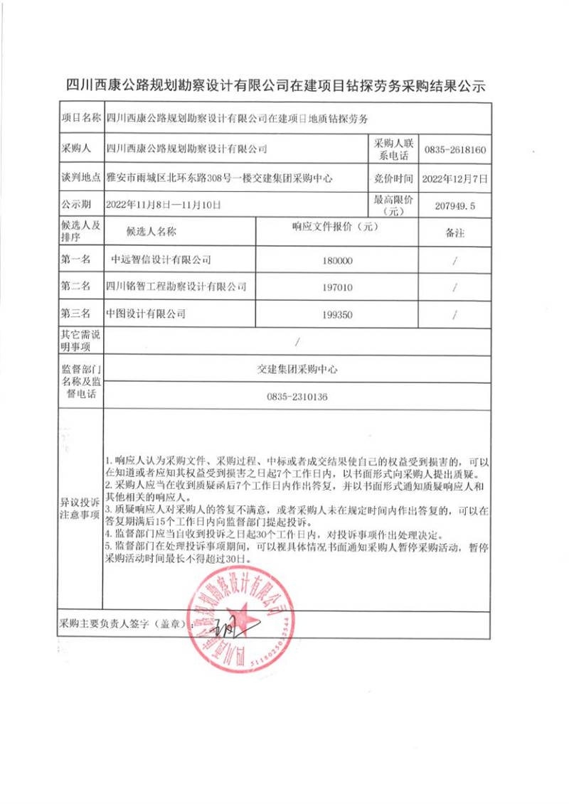 四川西康公路規(guī)劃勘察設計有限公司在建項目地質鉆探勞務采購結果公示