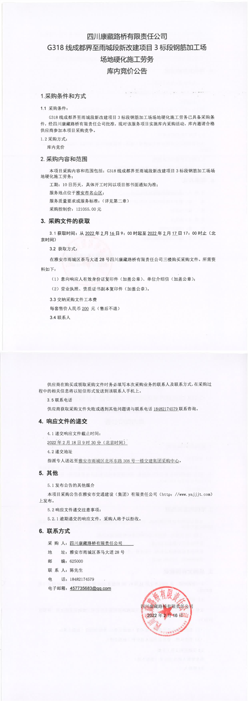四川康藏路橋有限責(zé)任公司G318線成都界至雨城段新改建項目3標(biāo)段鋼筋加工場場地硬化施工勞務(wù)庫內(nèi)競價公告
