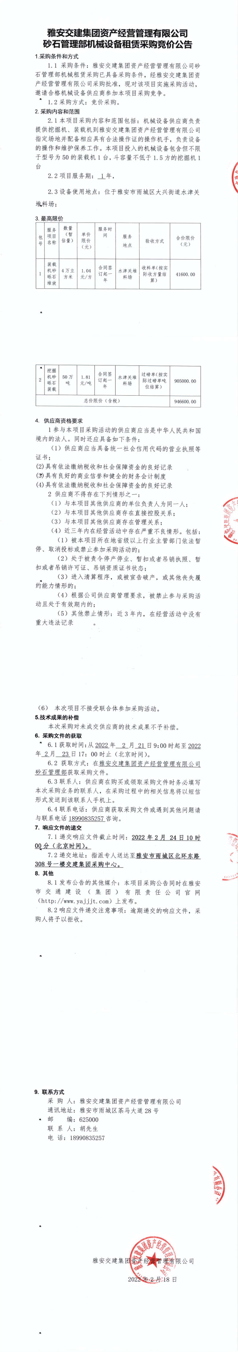 雅安交建集團(tuán)資產(chǎn)經(jīng)營(yíng)管理有限公司砂石管理部機(jī)械設(shè)備租賃采購(gòu)競(jìng)價(jià)公告