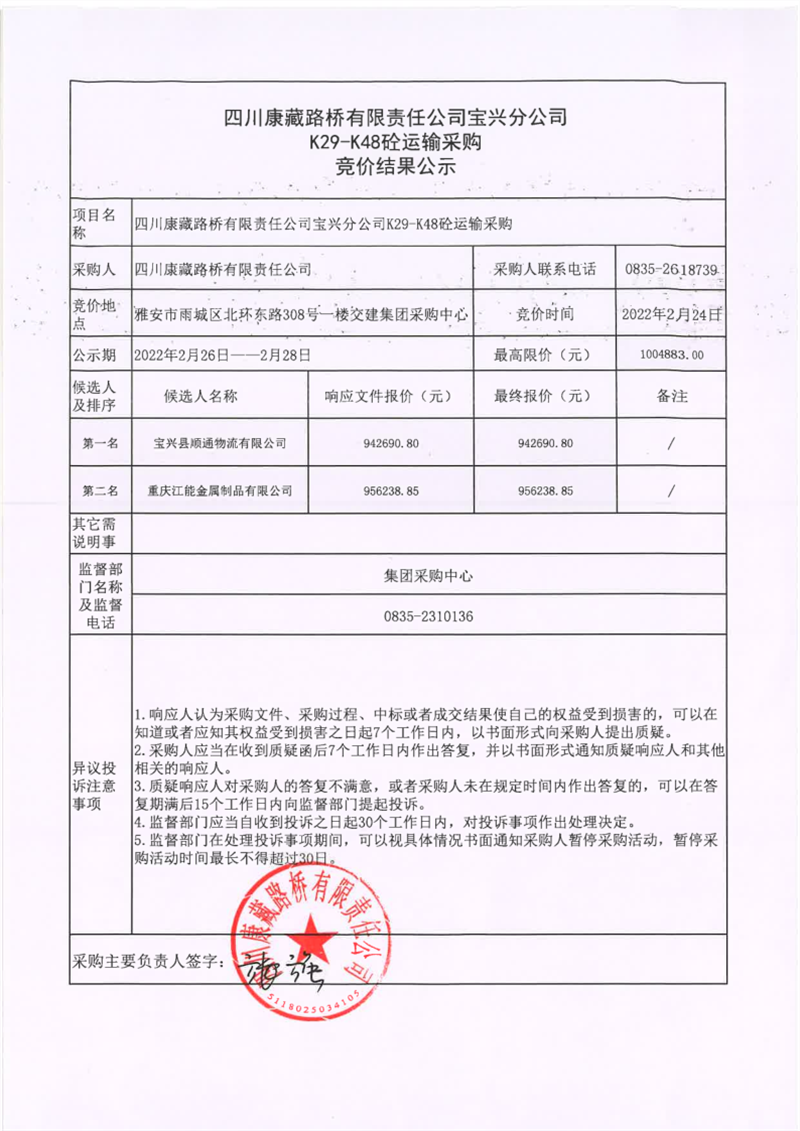 四川康藏路橋有限責(zé)任公司寶興分公司K29-K48砼運(yùn)輸采購競價(jià)結(jié)果公示