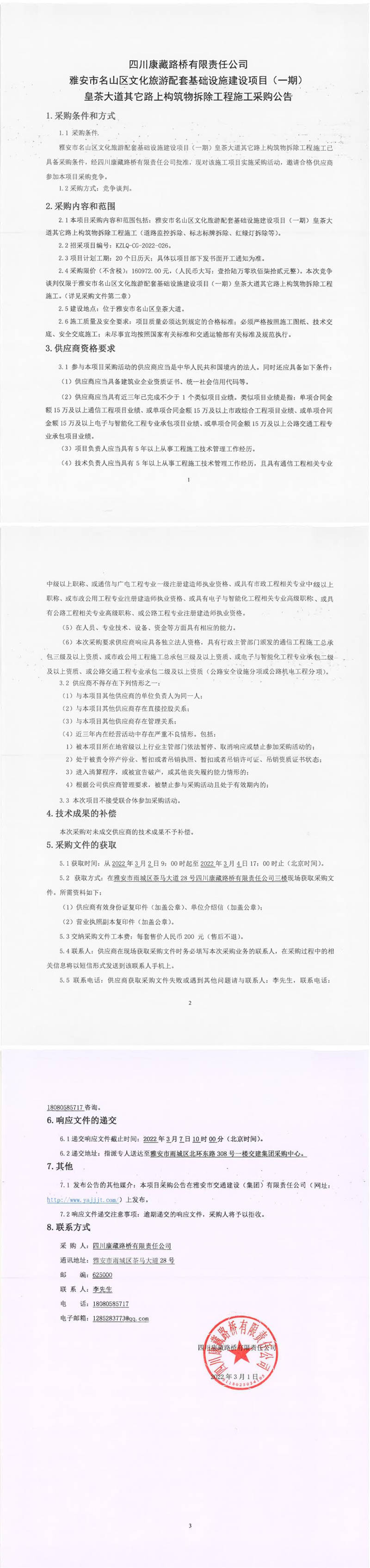 四川康藏路橋有限責任公司雅安市名山區(qū)文化旅游配套基礎設施建設項目(一期)皇茶大道其它路上構筑物拆除工程施工采購公告