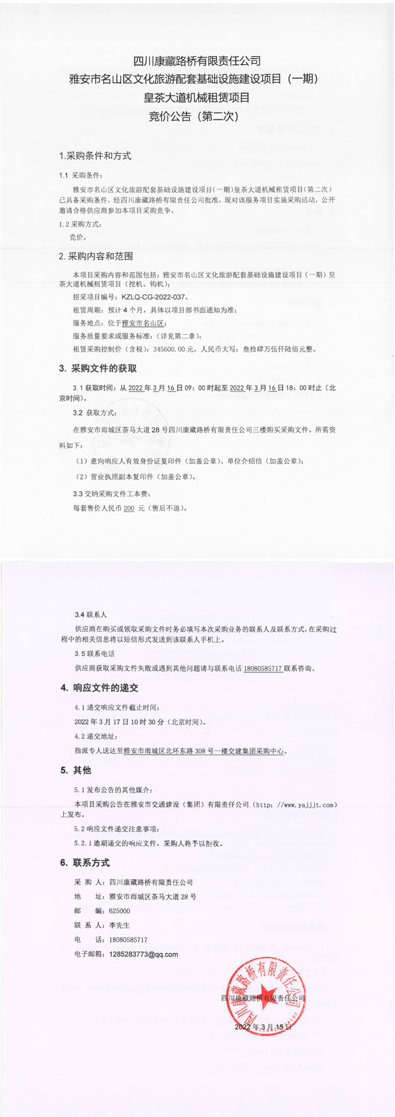 四川康藏路橋有限責(zé)任公司雅安市名山區(qū)文化旅游配套基礎(chǔ)設(shè)施建設(shè)項目(一期)皇茶大道機械租賃項目競價公告(第二次)