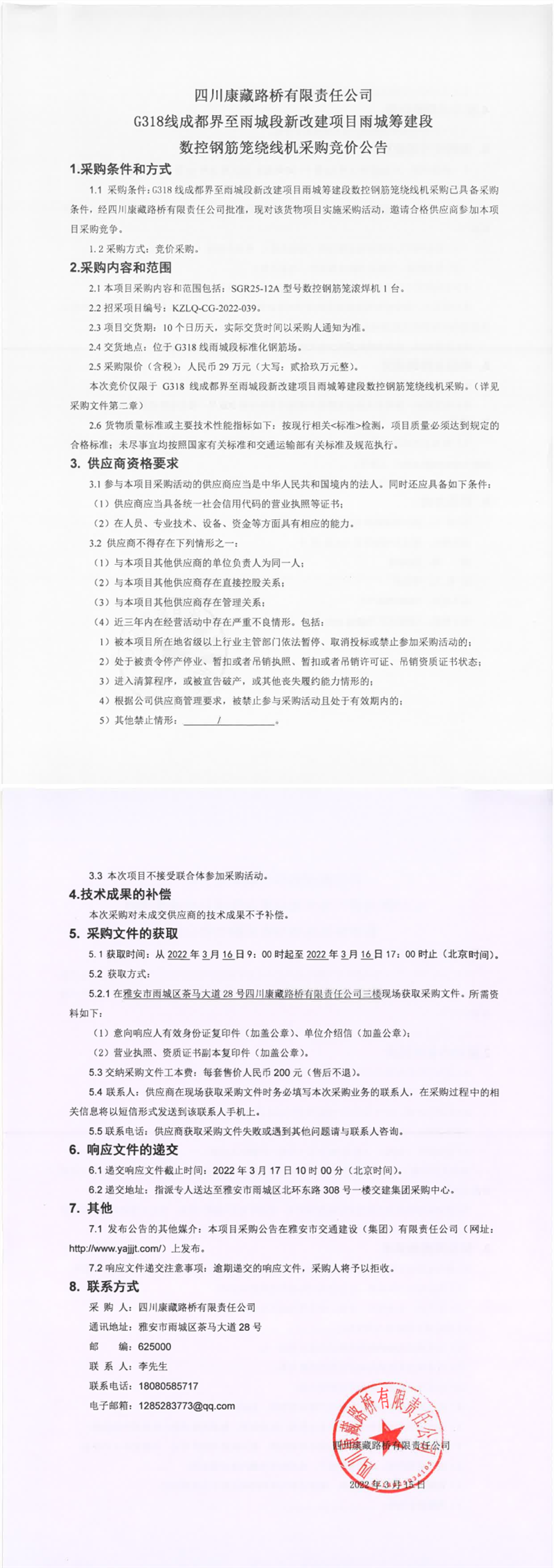 四川康藏路橋有限責任公司G318線成都界至雨城段新改建項目雨城籌建段數(shù)控鋼筋籠繞線機采購競價公告