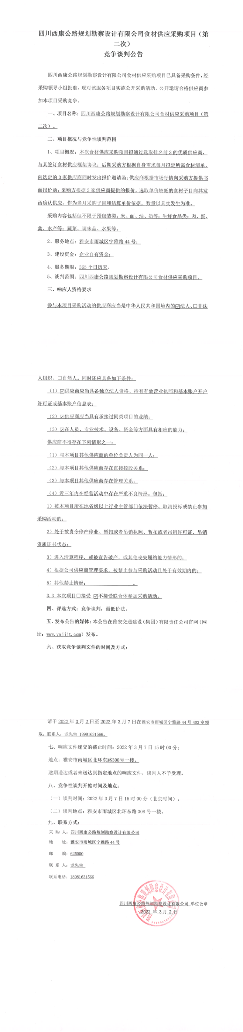四川西康公路規(guī)劃勘察設(shè)計(jì)有限公司食材供應(yīng)采購項(xiàng)目(第二次)競爭談判公告