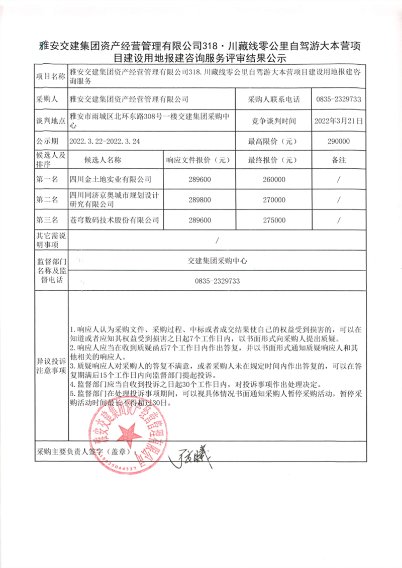 雅安交建集團資產經營管理有限公司318川藏線零公里自駕游大本營項目建設用地報建咨詢服務評審結果公示