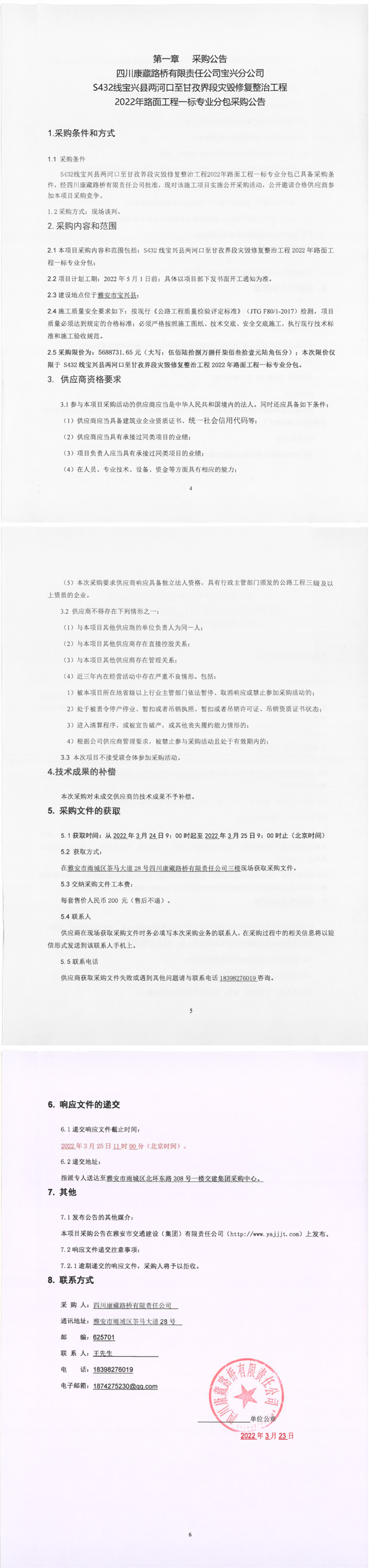四川康藏路橋有限責(zé)任公司S432線寶興縣兩河口至甘孜界段災(zāi)毀修復(fù)整治工程2022年路面工程一標(biāo)專業(yè)分包采購公告