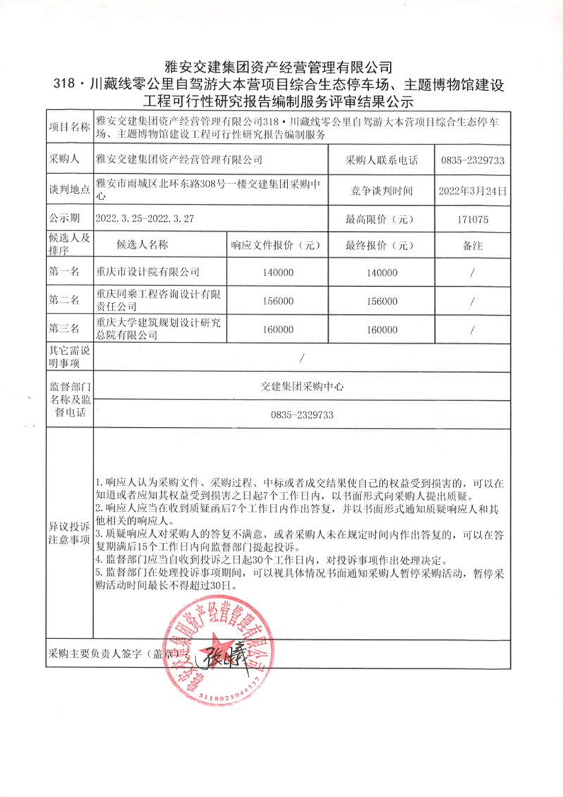 雅安交建集團資產(chǎn)經(jīng)營管理有限公司318.川藏線零公里自駕游大本營項目綜合生態(tài)停車場、主題博物館建設工程可行性研究報告編制服務評審結果公示