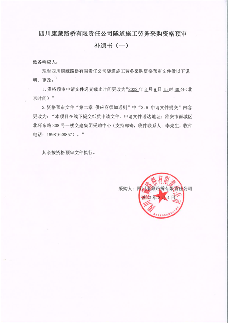 四川康藏路橋有限責(zé)任公司隧道施工勞務(wù)采購資格預(yù)審補遺書(一)