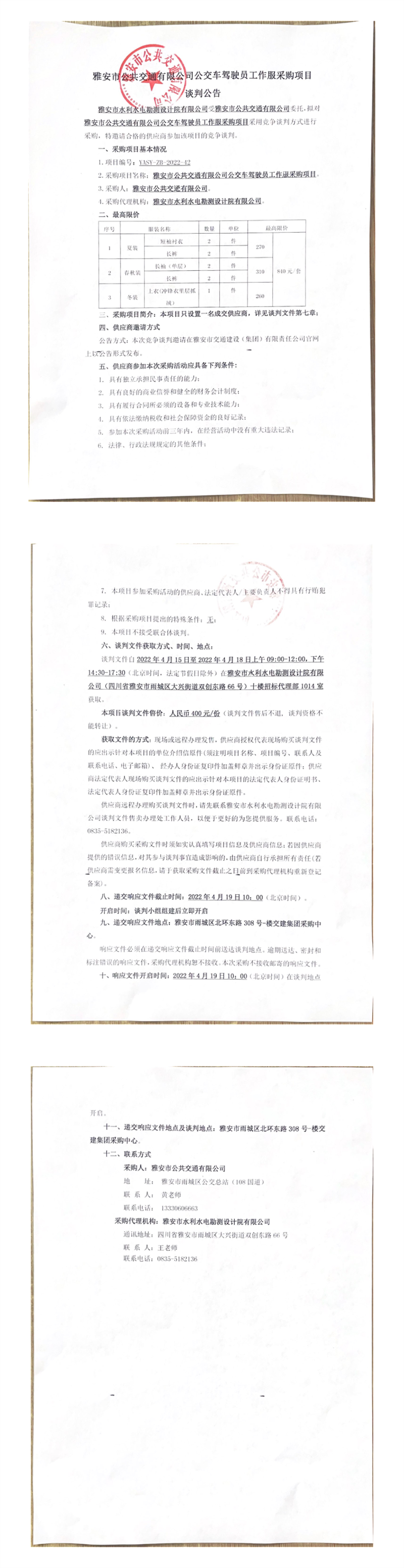 雅安市公共交通有限公司公交車(chē)駕駛員工作服采購(gòu)項(xiàng)目談判公告