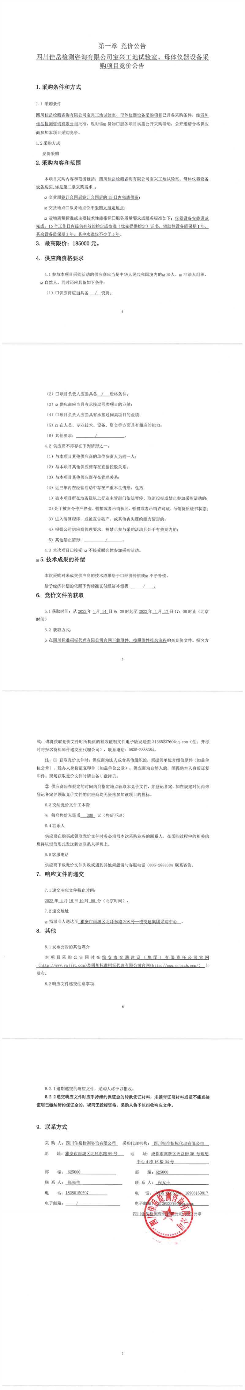 四川佳岳檢測咨詢有限公司寶興工地試驗(yàn)室、母體儀器設(shè)備采購項目競價公告