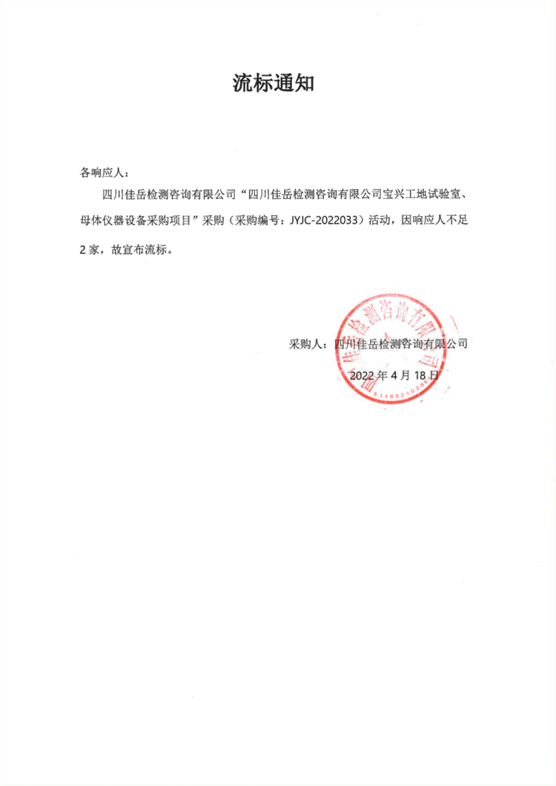 四川佳岳檢測咨詢有限公司寶興工地試驗(yàn)室、母體儀器設(shè)備采購項(xiàng)目流標(biāo)通知