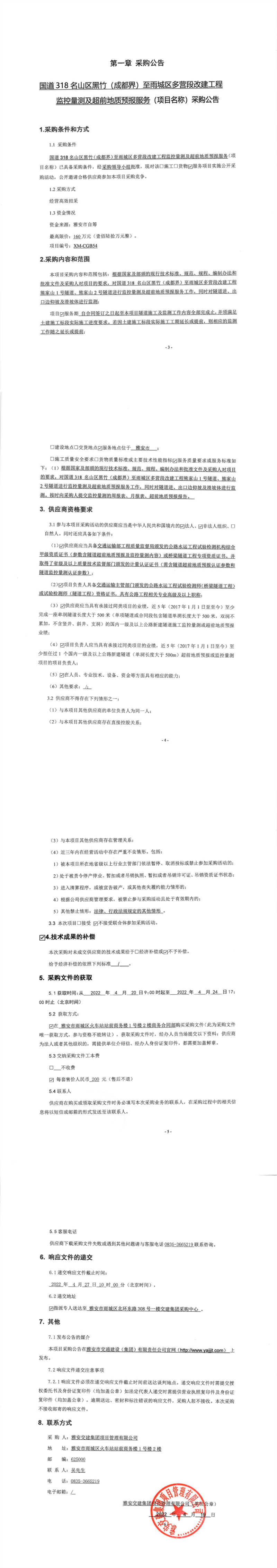 雅安交建集團(tuán)項(xiàng)目管理有限公司國(guó)道318名山區(qū)黑竹(成都界)至雨城區(qū)多營(yíng)段改建工程監(jiān)控量測(cè)及超前地質(zhì)預(yù)報(bào)服務(wù)采購(gòu)公告