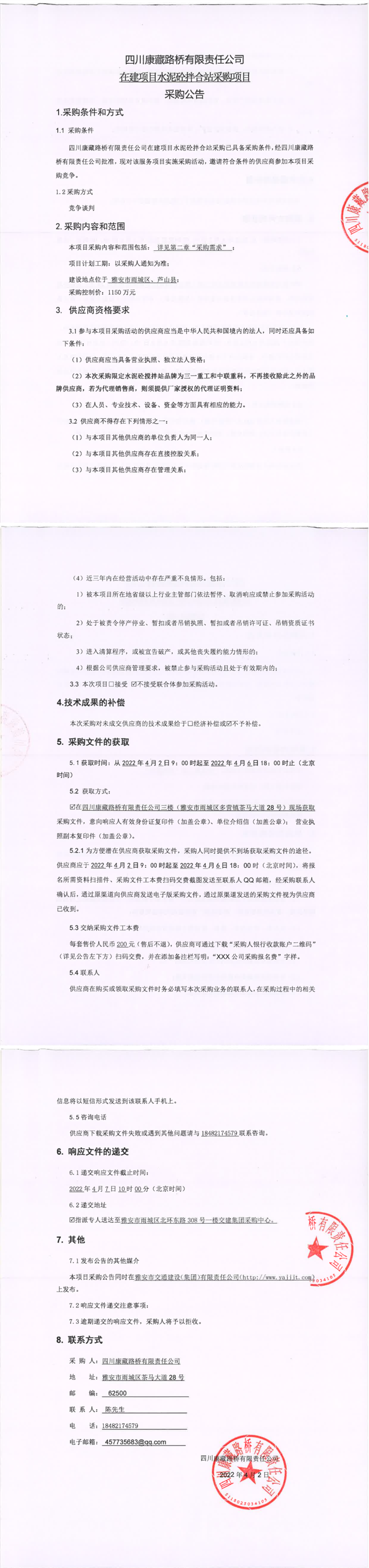 四川康藏路橋有限責(zé)任公司在建項(xiàng)目水泥砼拌合站采購項(xiàng)目采購公告