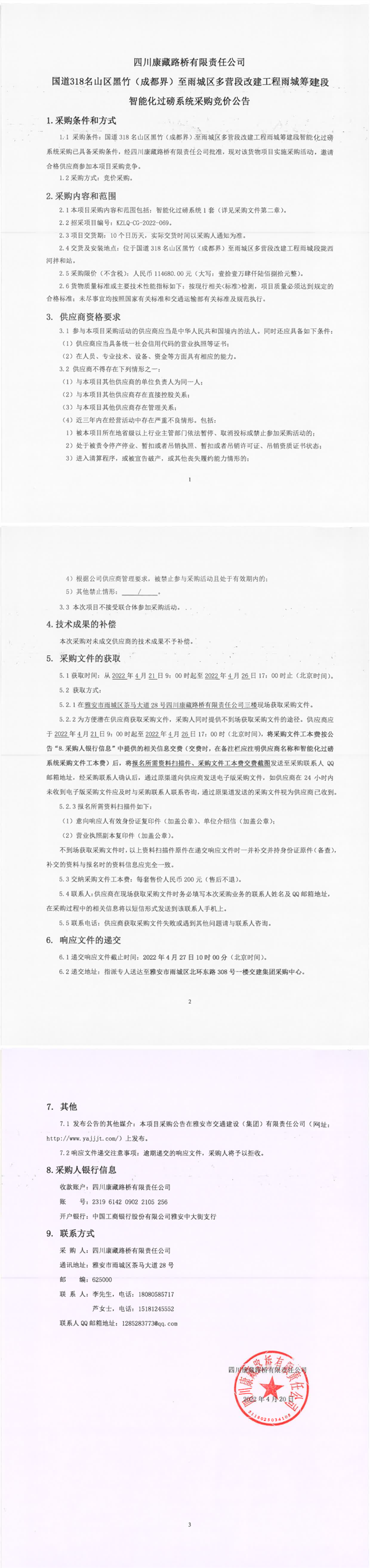 四川康藏路橋有限責任公司國道318名山區(qū)黑竹(成都界)至雨城區(qū)多營段改建工程雨城籌建段智能化過磅系統(tǒng)采購競價公告