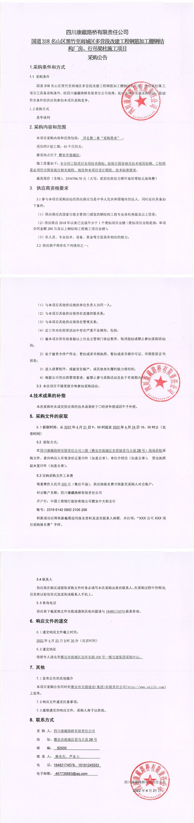 四川康藏路橋有限責(zé)任公司國(guó)道318名山區(qū)黑竹至雨城區(qū)多營(yíng)段改建工程鋼筋加工棚鋼結(jié)構(gòu)廠(chǎng)房、行吊梁柱施工項(xiàng)目采購(gòu)公告