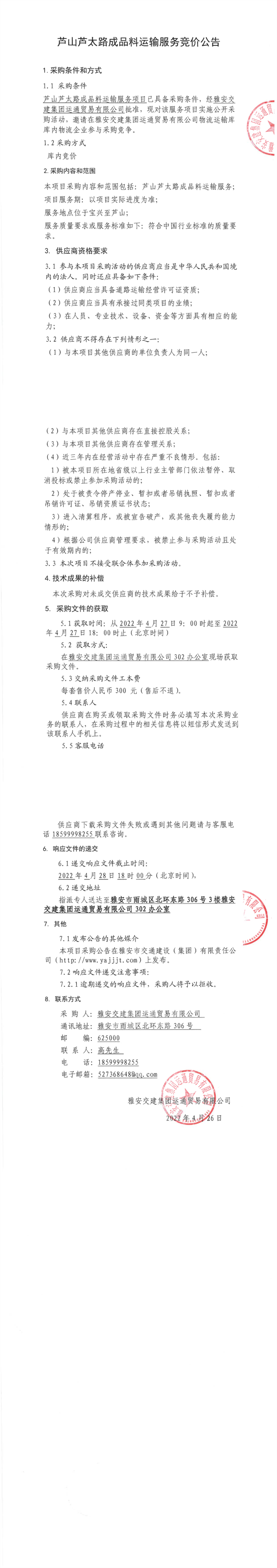 雅安交建集團(tuán)運通貿(mào)易有限公司蘆山蘆太路成品料運輸服務(wù)競價公告