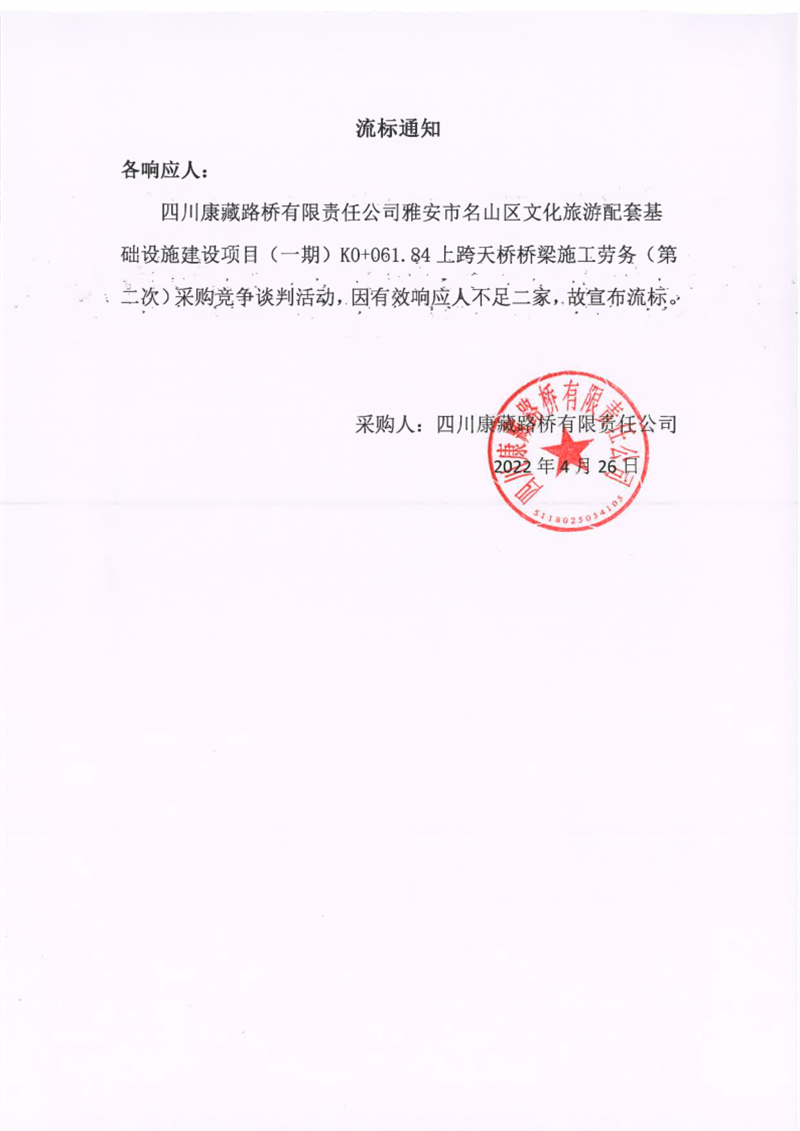 四川康藏路橋有限責任公司雅安市名山區(qū)文化旅游配套基礎(chǔ)設(shè)施建設(shè)項目(一期)K0+061.84上跨天橋橋梁施工勞務(wù)(第二次)流標通知
