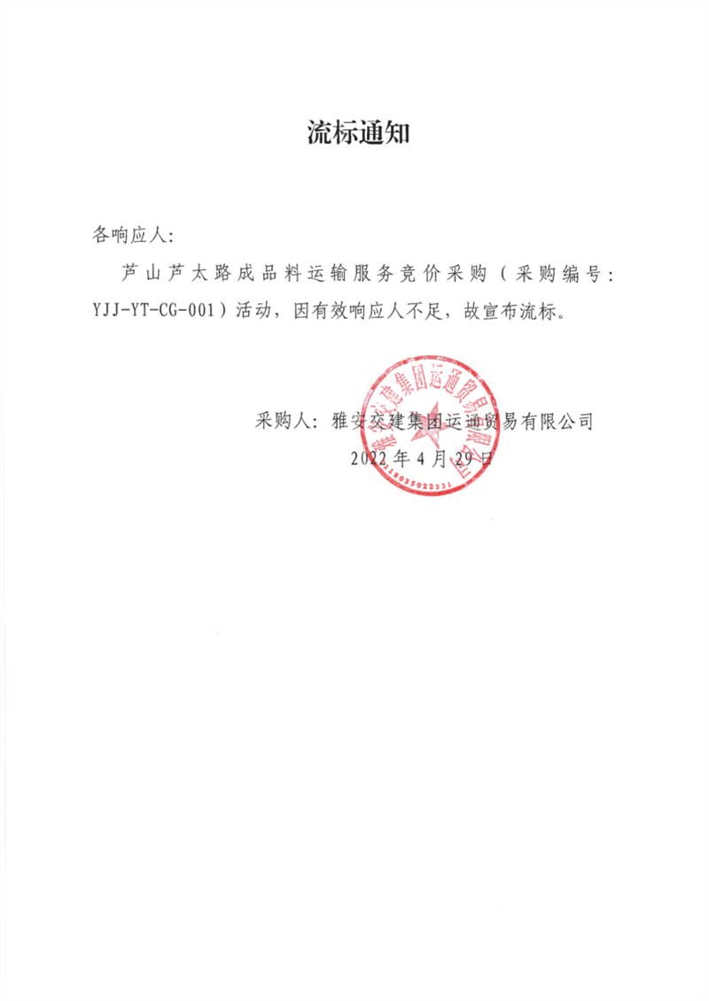 雅安交建集團(tuán)運(yùn)通貿(mào)易有限公司蘆山蘆太路成品料運(yùn)輸服務(wù)競(jìng)價(jià)采購流標(biāo)通知