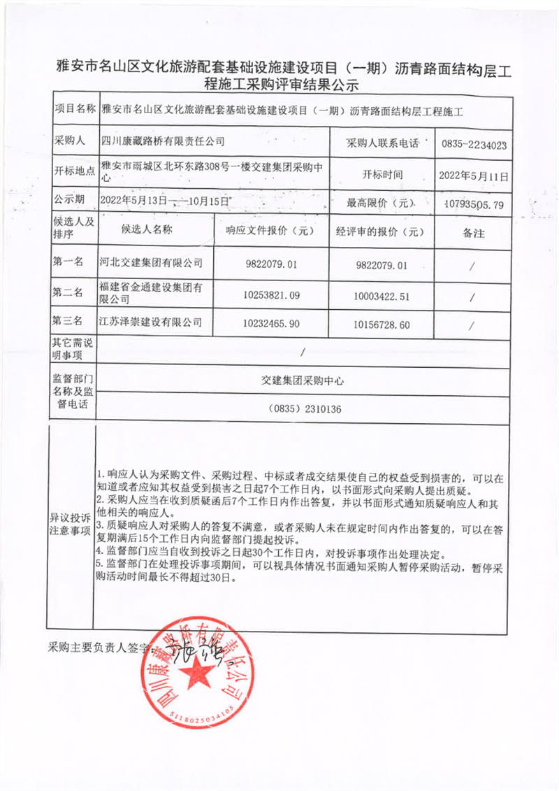 四川康藏路橋有限責任公司雅安市名山區(qū)文化旅游配套基礎設施建設項目(一期)瀝青路面結(jié)構(gòu)層工程施工采購評審結(jié)果公示