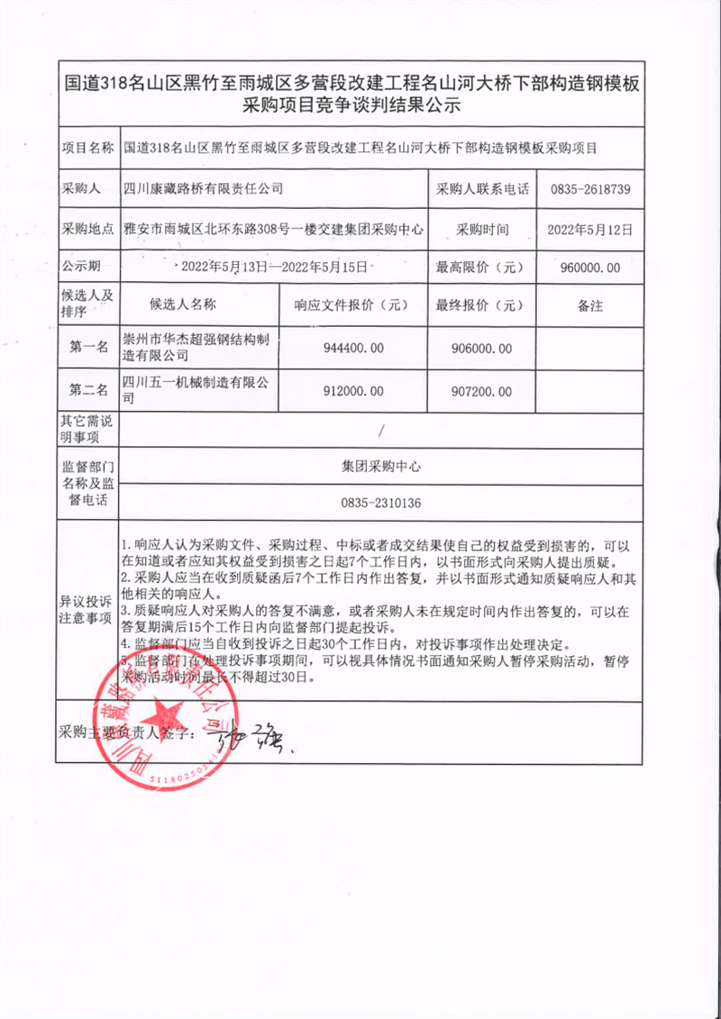 四川康藏路橋有限責(zé)任公司國道318名山區(qū)黑竹至雨城區(qū)多營段改建工程名山河大橋下部構(gòu)造鋼模板采購項(xiàng)目競爭談判結(jié)果公示