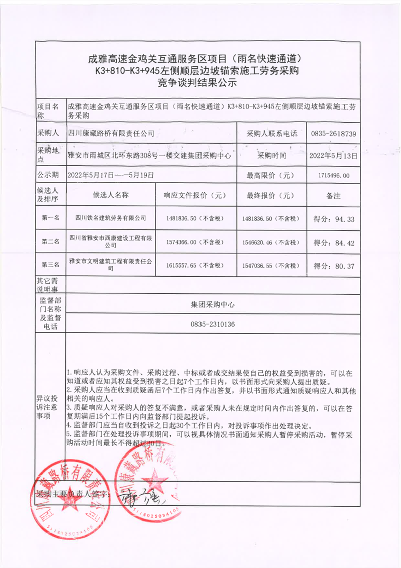 四川康藏路橋有限責任公司成雅高速金雞關(guān)互通服務(wù)區(qū)項目(雨名快速通道)K3+810-K3+945左側(cè)順層邊坡錨索施工勞務(wù)采購競爭談判結(jié)果公示
