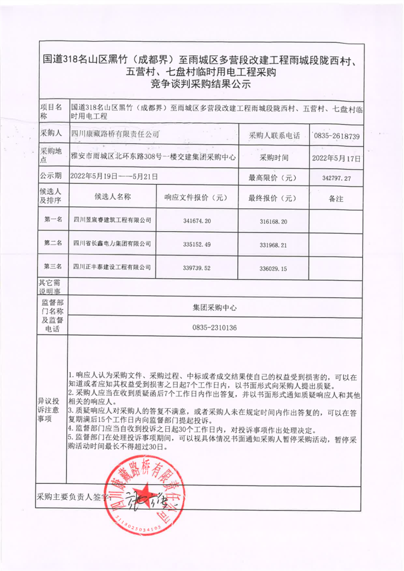 四川康藏路橋有限責任公司國道318名山區(qū)黑竹(成都界)至雨城區(qū)多營段改建工程雨城段隴西村、五營村、七盤村臨時用電工程采購競爭談判結果公示