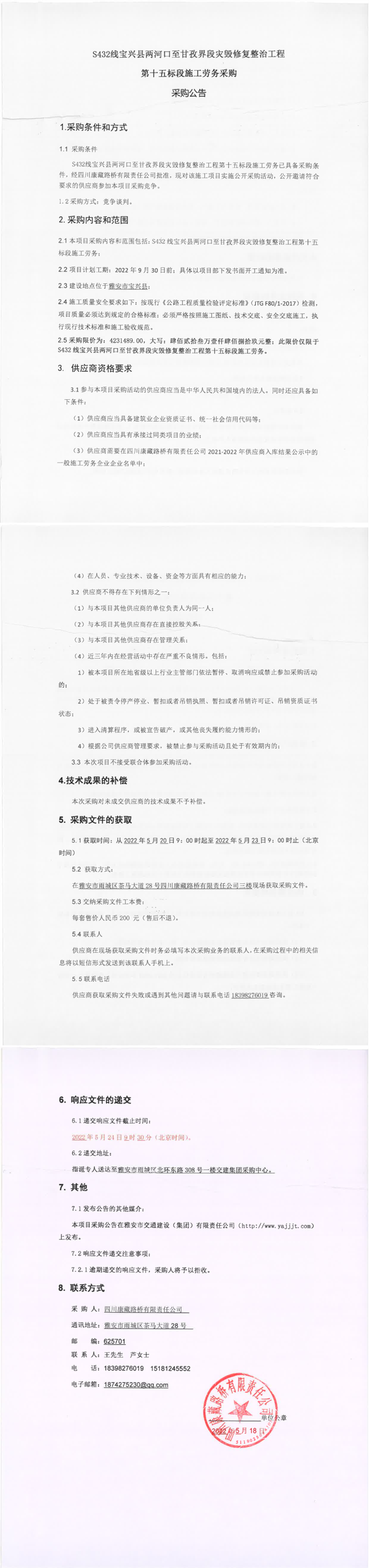 四川康藏路橋有限責(zé)任公司S432線寶興縣兩河口至甘孜界段災(zāi)毀修復(fù)整治工程第十五標(biāo)段施工勞務(wù)采購(gòu)采購(gòu)公告