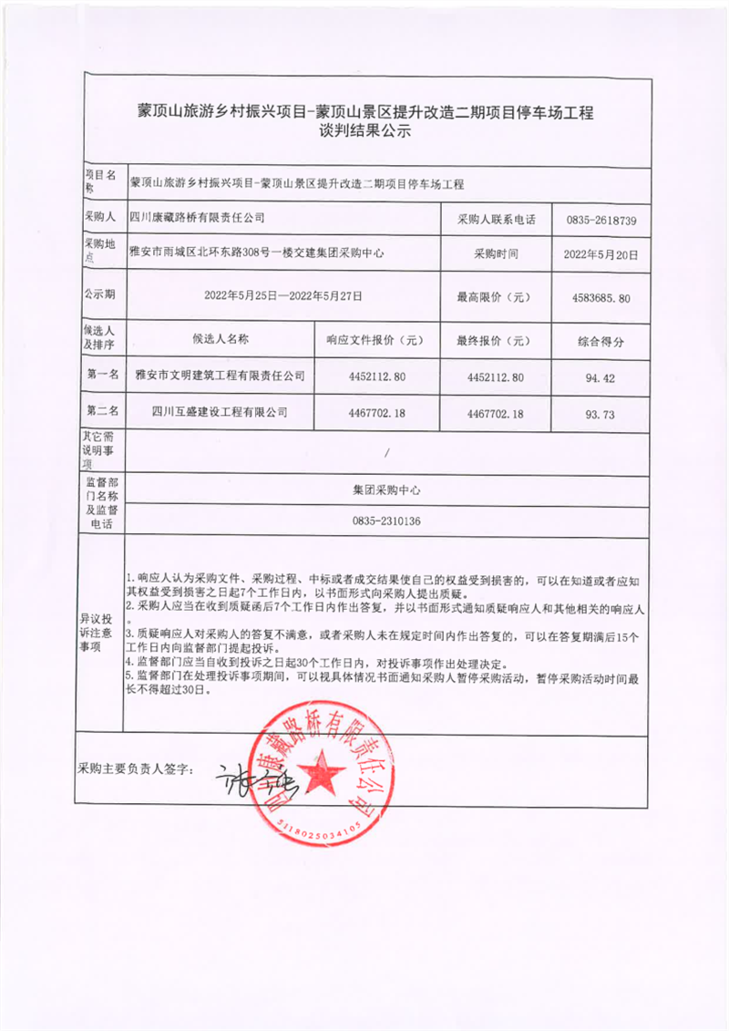 四川康藏路橋有限責任公司蒙頂山旅游鄉(xiāng)村振興項目-蒙頂山景區(qū)提升改造二期項目停車場工程談判結果公示