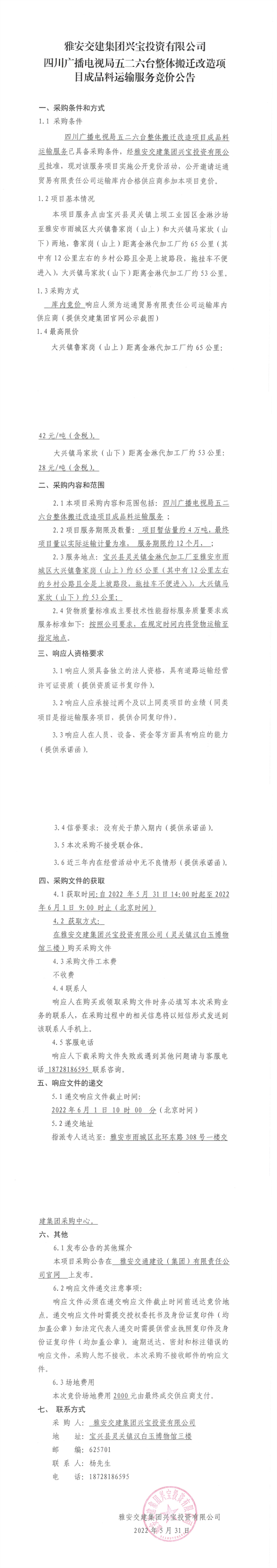 雅安交建集團(tuán)興寶投資有限公司四川廣播電視局五二六臺整體搬遷改造項目成品料運(yùn)輸服務(wù)競價公告