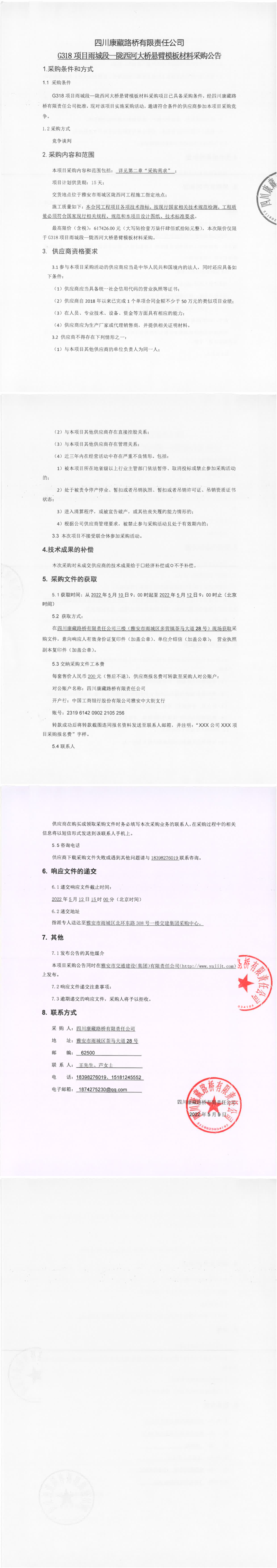 四川康藏路橋有限責任公司G318項目雨城段-隴西河大橋懸臂模板材料采購公告
