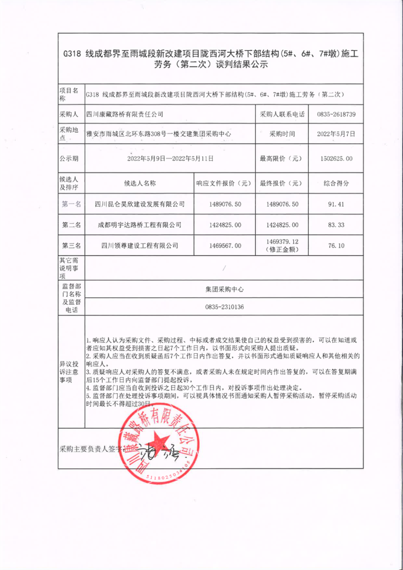四川康藏路橋有限責(zé)任公司G318線成都界至雨城段新改建項(xiàng)目隴西河大橋下部結(jié)構(gòu)(5#、6#、7#墩)施工勞務(wù)(第二次)談判結(jié)果公示